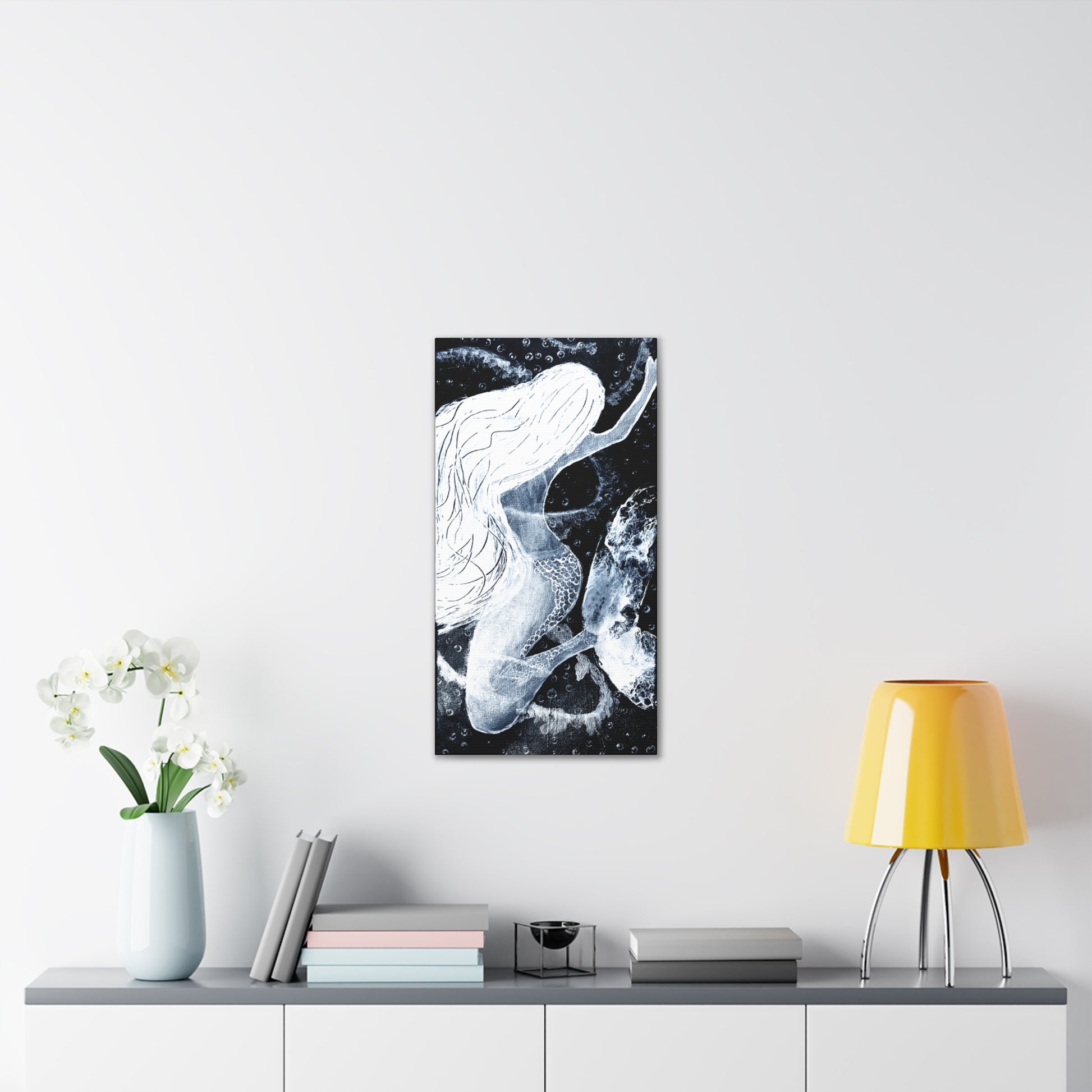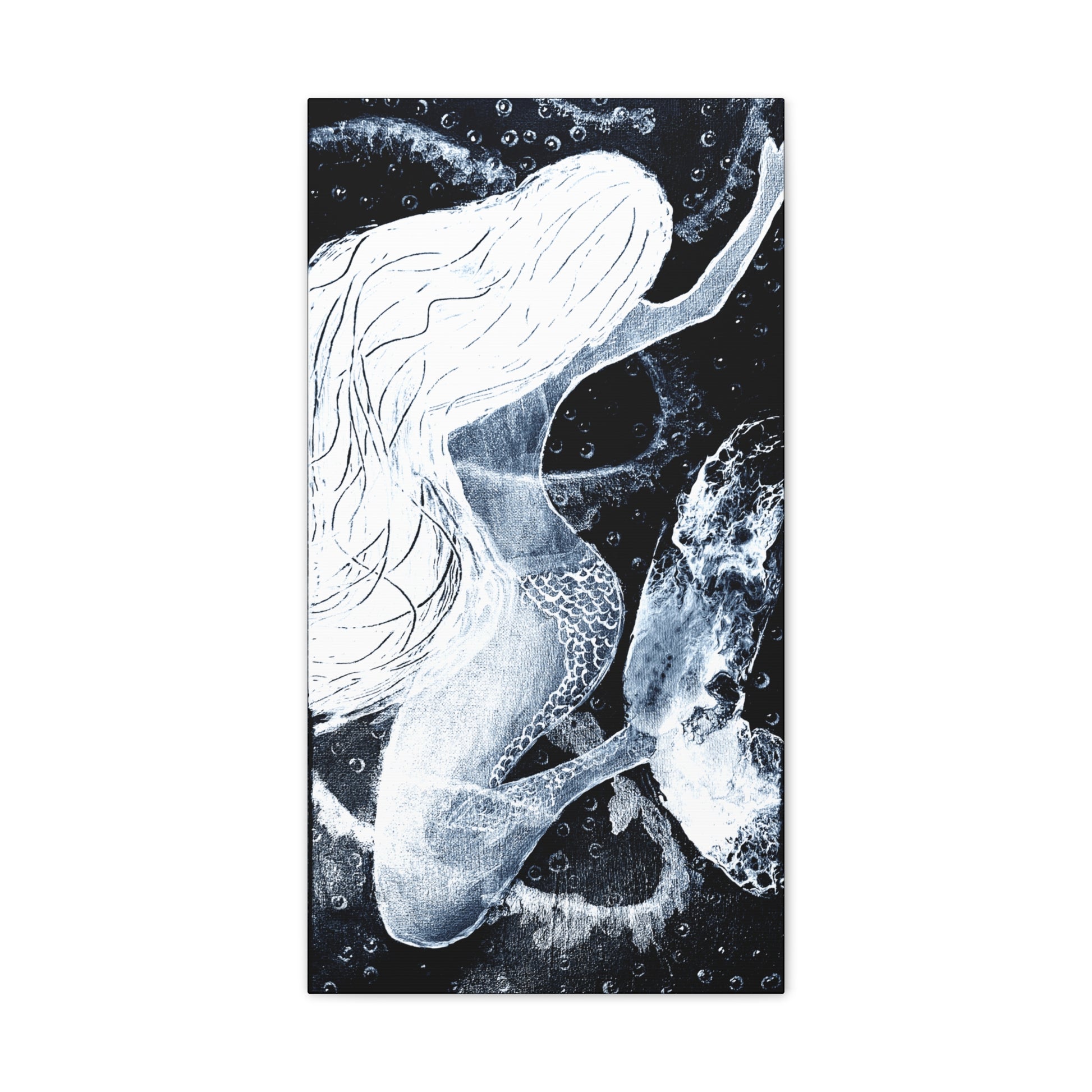 Dive into the mystical depths with "Mermaid's Embrace" mermaid canvas art. This enchanting piece captures the fluid and graceful silhouette of a mermaid submerged in the deep ocean, bathed in soft, ethereal light. The gentle flow of her hair and the tranquil motion of the water create a dreamlike atmosphere, evoking the serenity and mystery of the sea. With its deep contrasts of light and shadow, this artwork is perfect for those who are drawn to the magic of the ocean and its mythical creatures.