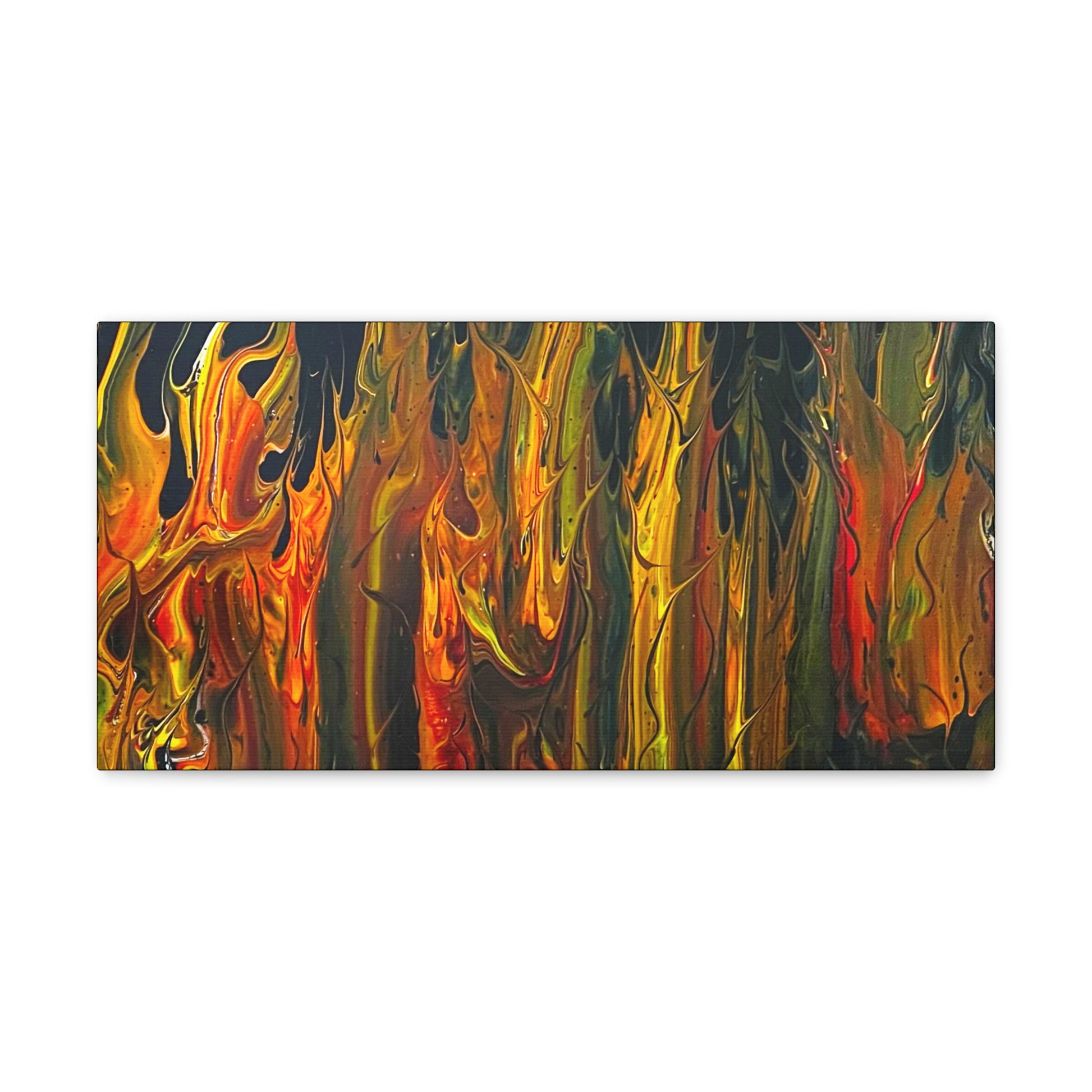 Elevate your space with the striking beauty of "Lonely Trees," a captivating piece of abstract art that brings together the intense hues of a fiery landscape with the mysterious allure of a secluded forest. This artwork blends deep blacks and browns with vibrant oranges, reds, and yellows, creating a mesmerizing play of light and shadow that evokes the raw power and solitude of nature.