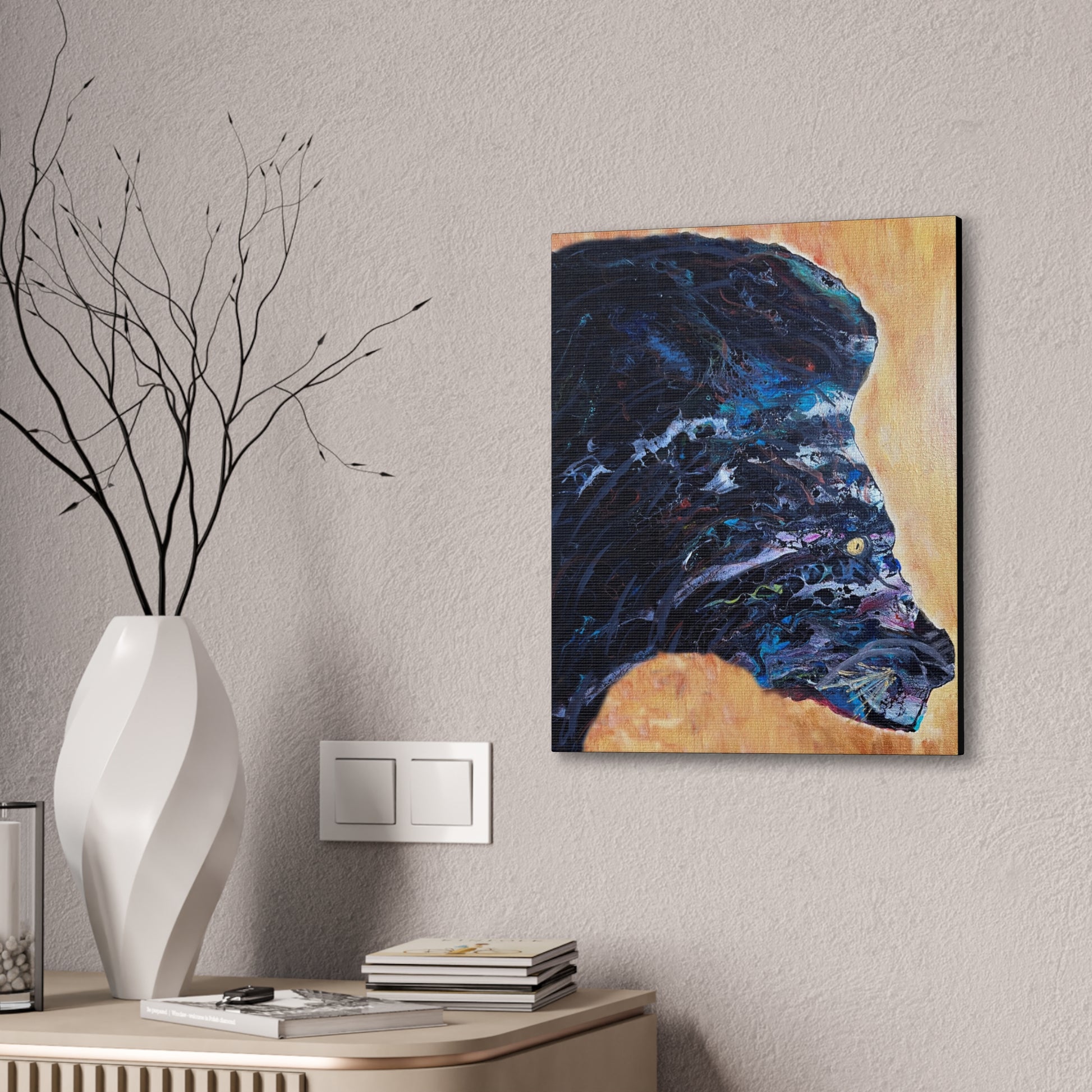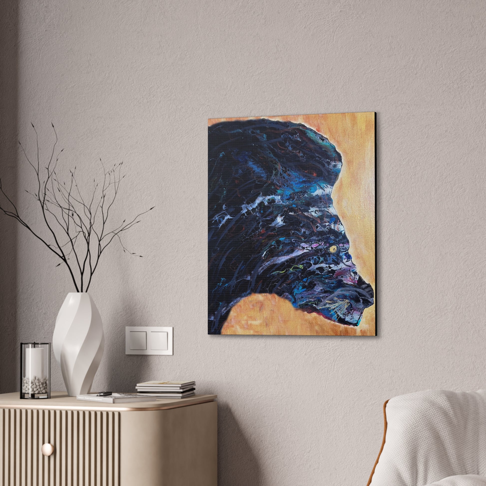 Embrace the mystique of the "Midnight Beast" abstract canvas art. This captivating piece features the powerful silhouette of a creature, seemingly emerging from swirling darkness, with deep blues, purples, and black tones that evoke a sense of mystery and strength. Set against a contrasting backdrop of warm golden hues, the figure stands out in bold contrast, making this artwork both dramatic and eye-catching. Perfect for modern, eclectic, or nature-inspired spaces, "Midnight Beast" adds an element of intrigue and boldness to any room.