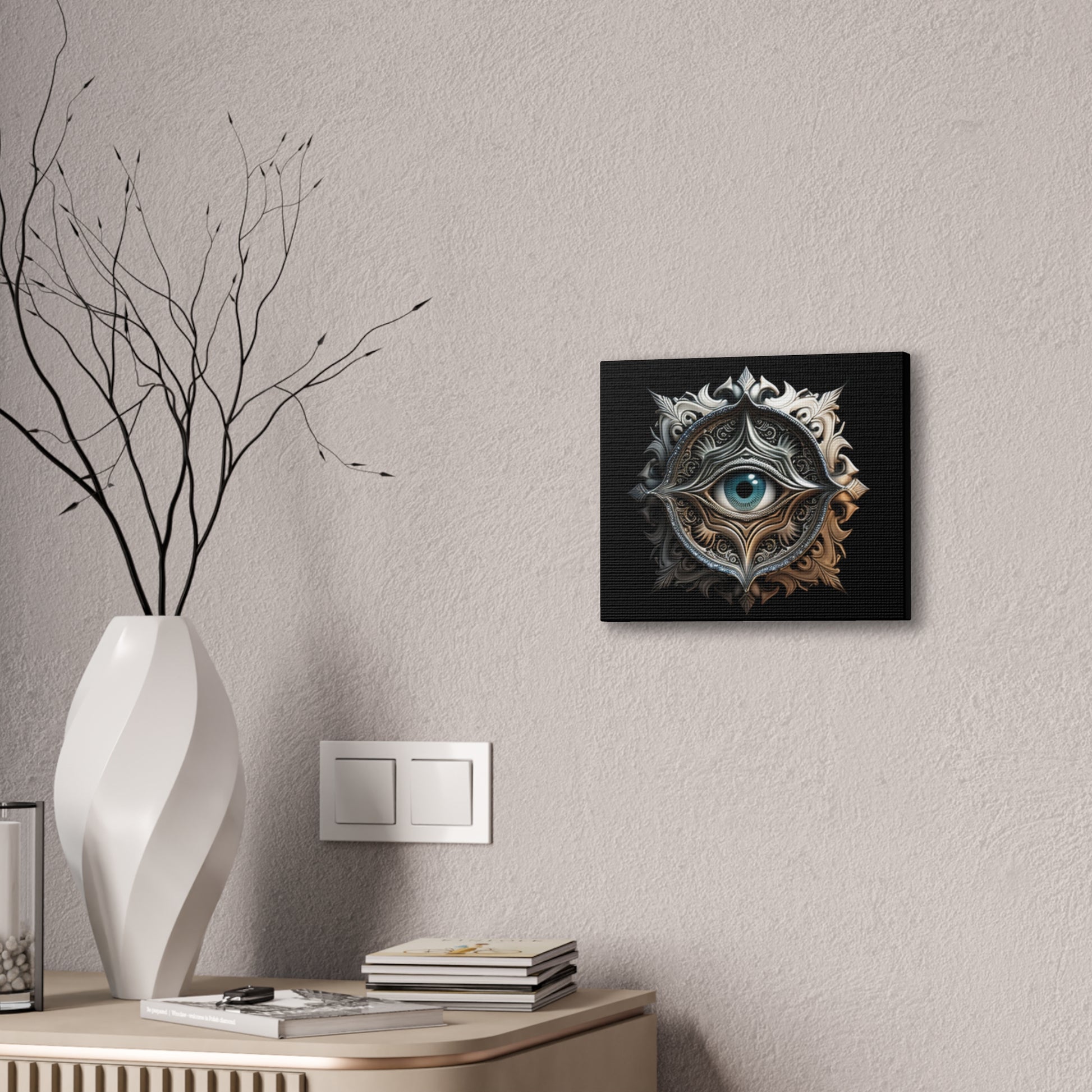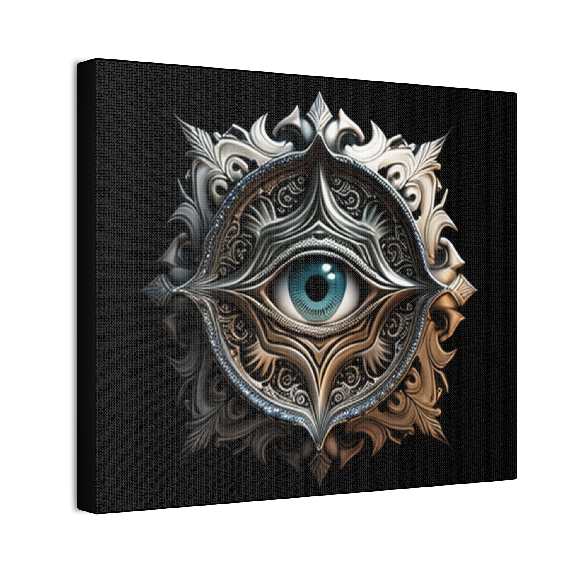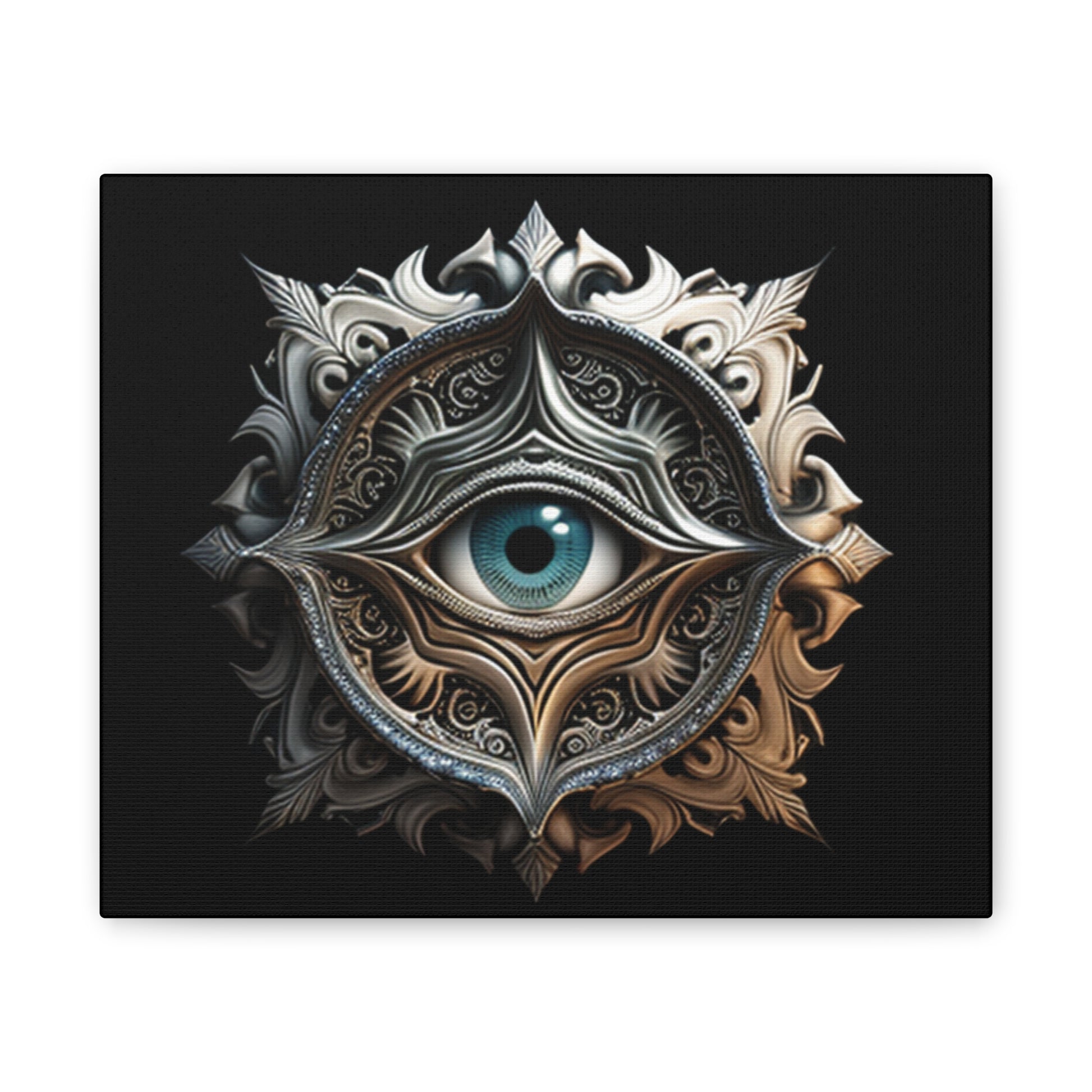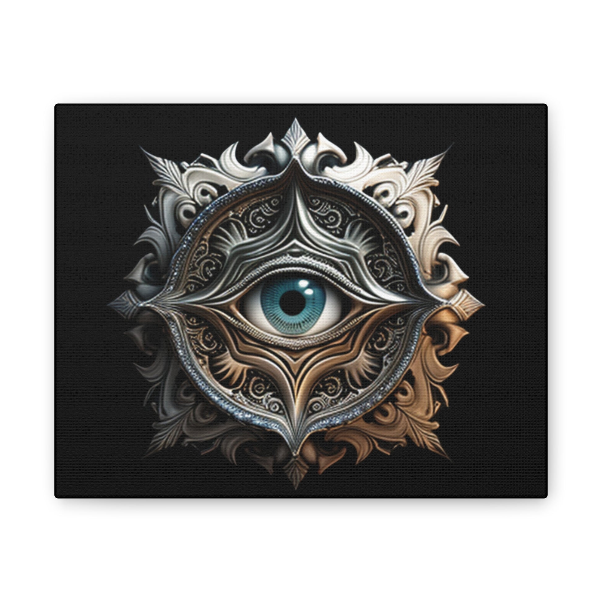 Unveil the mysteries of the universe with this surrealist abstract eye artwork, meticulously crafted and printed on 100% polyester canvas. Stretched on a durable .75" pinewood frame, this piece combines mystique with durability, making it a perfect statement for any room. The ornate celestial design, centered around a captivating eye, blends dark and metallic tones, creating an alluring focal point. Available in multiple sizes, this artwork ensures that it can fit any space, from intimate corners to large feature walls. Add a touch of enigmatic charm to your space with this bold and mysterious art.
