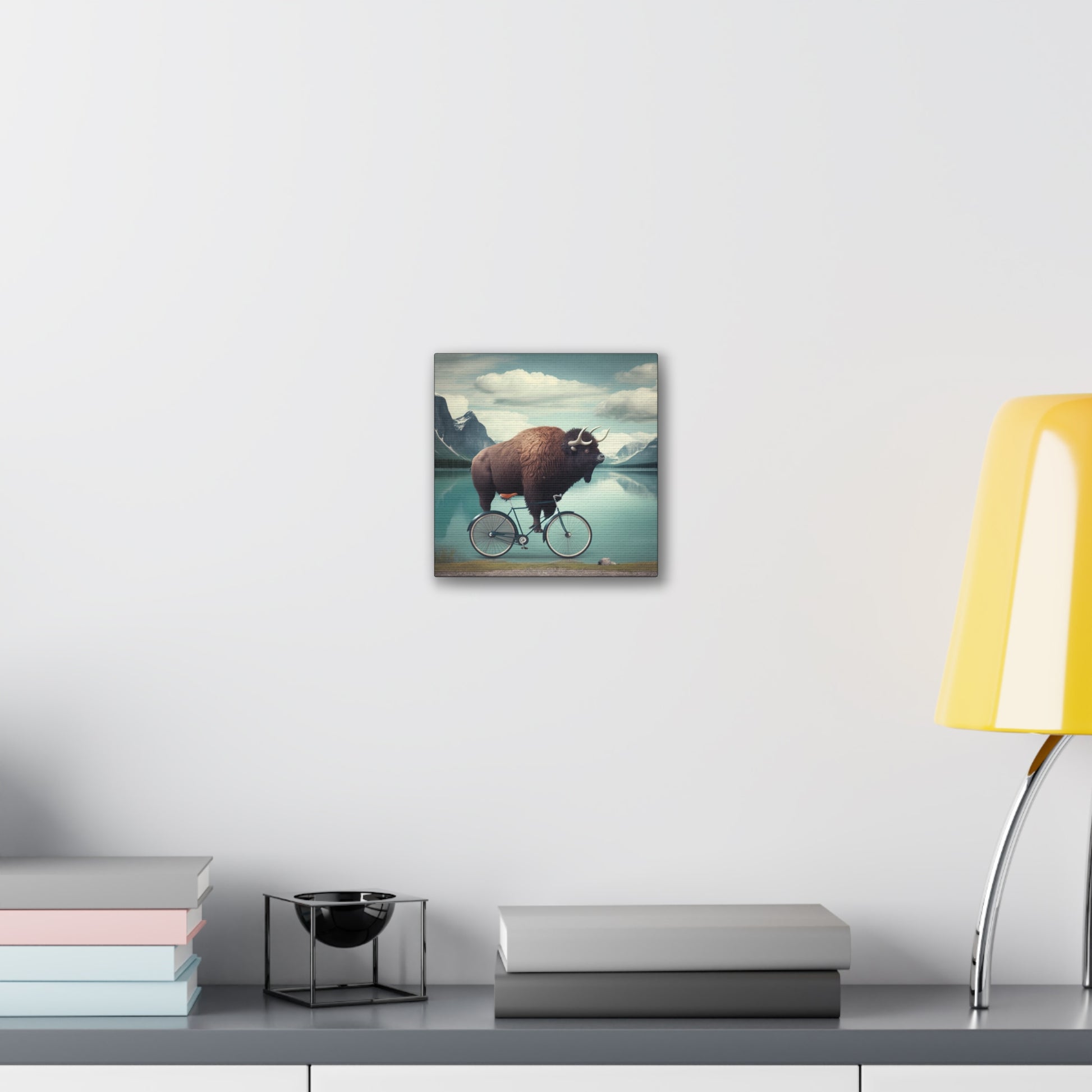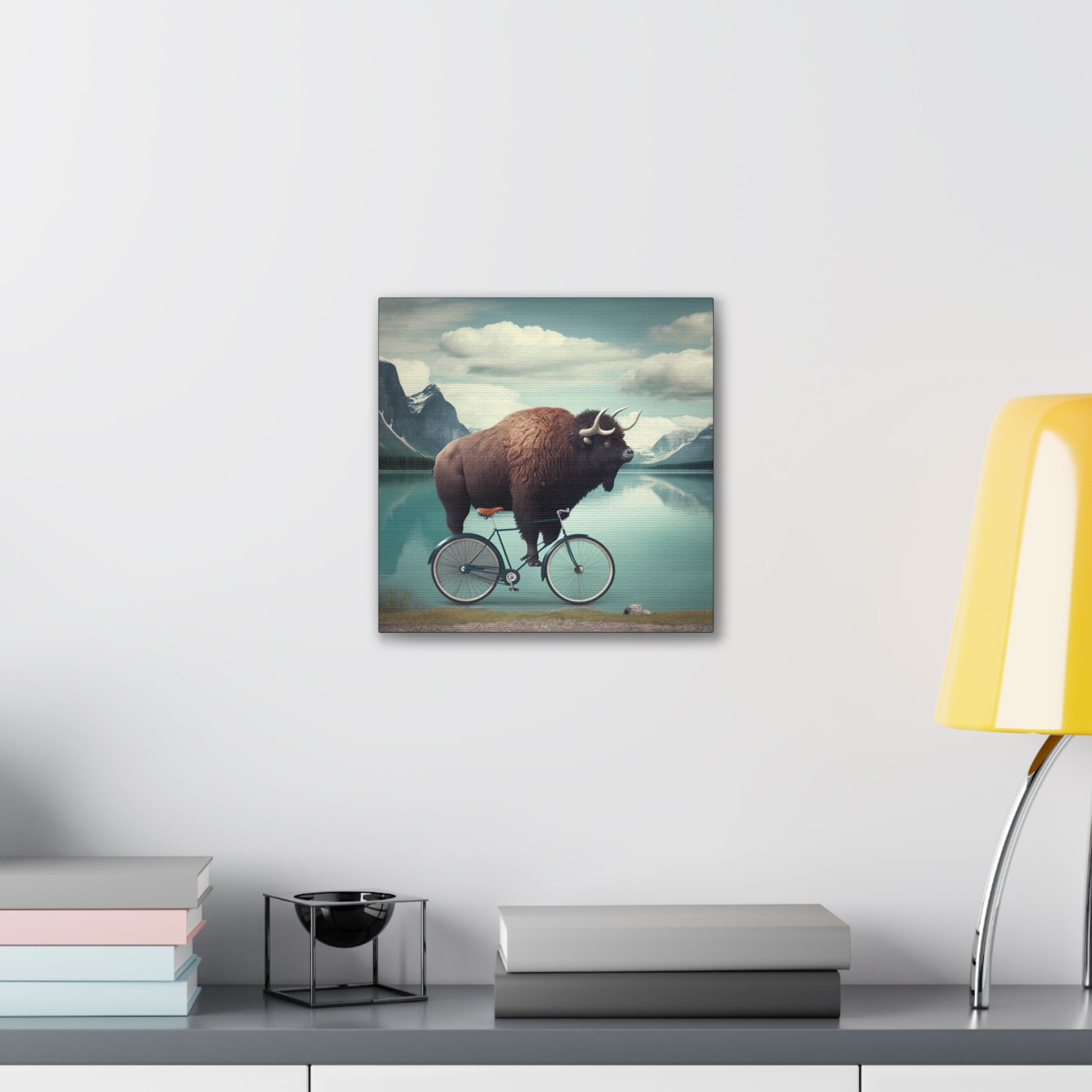 Embrace the playful side of nature with "Ride of the Bison," a humorous and imaginative canvas that depicts a bison casually riding a bicycle against a backdrop of serene mountains and a calm lake. The surreal combination of a majestic wild animal and a bicycle creates a delightful and whimsical scene that will surely spark conversation and bring a smile to any space.