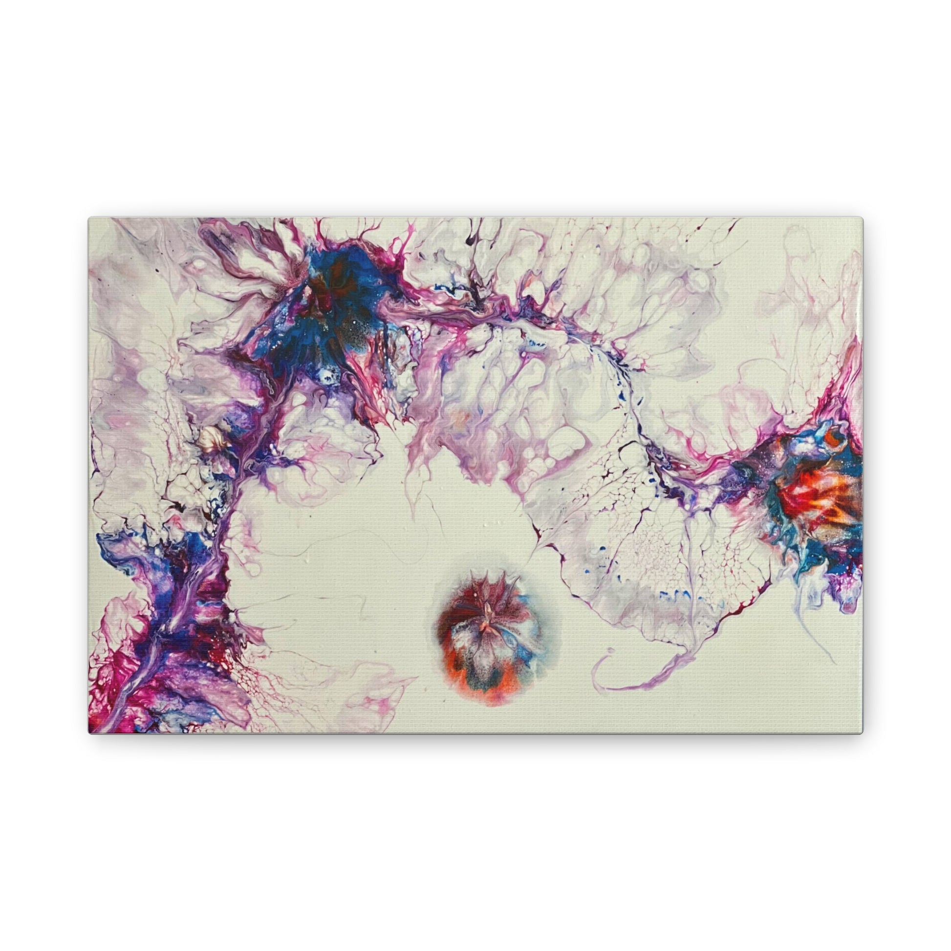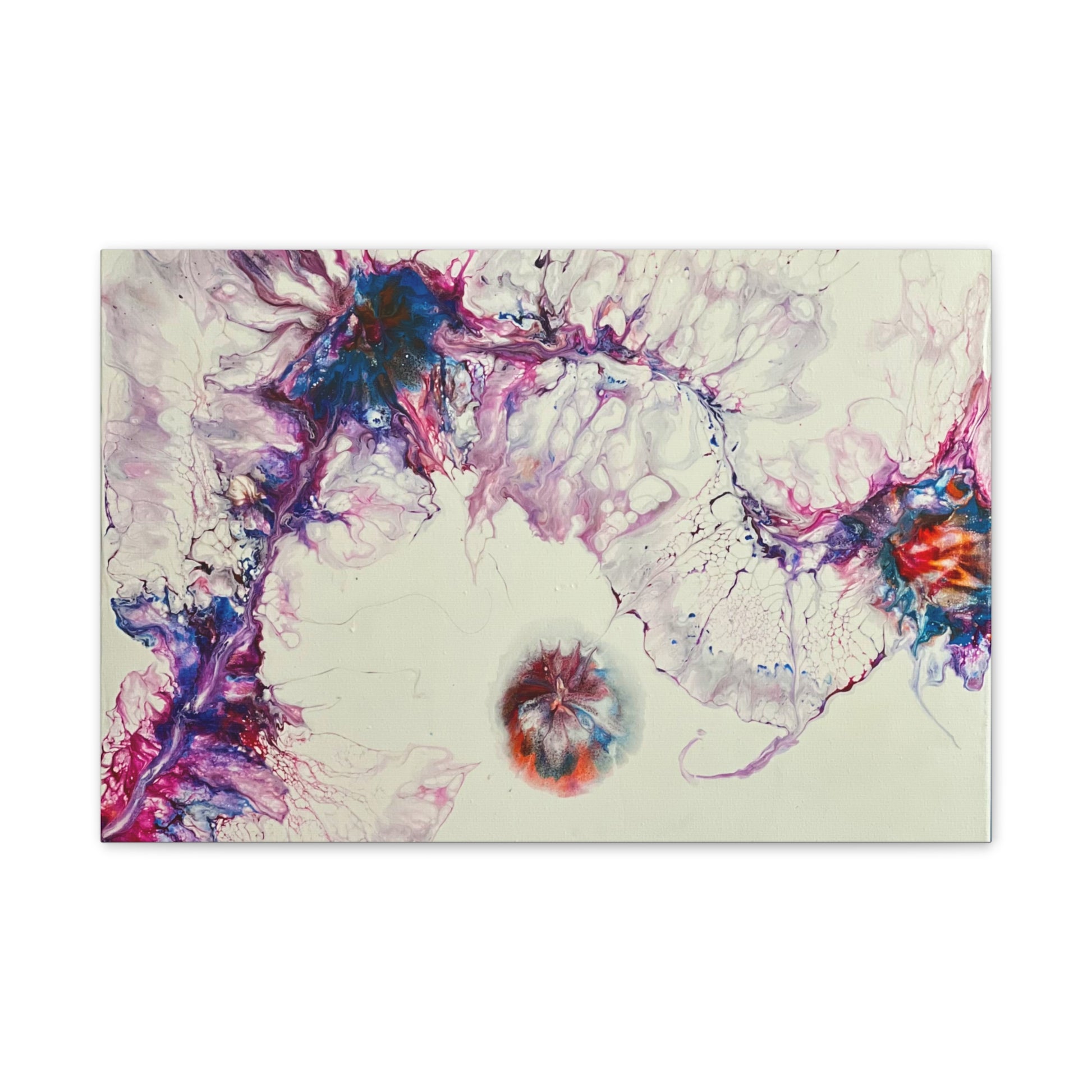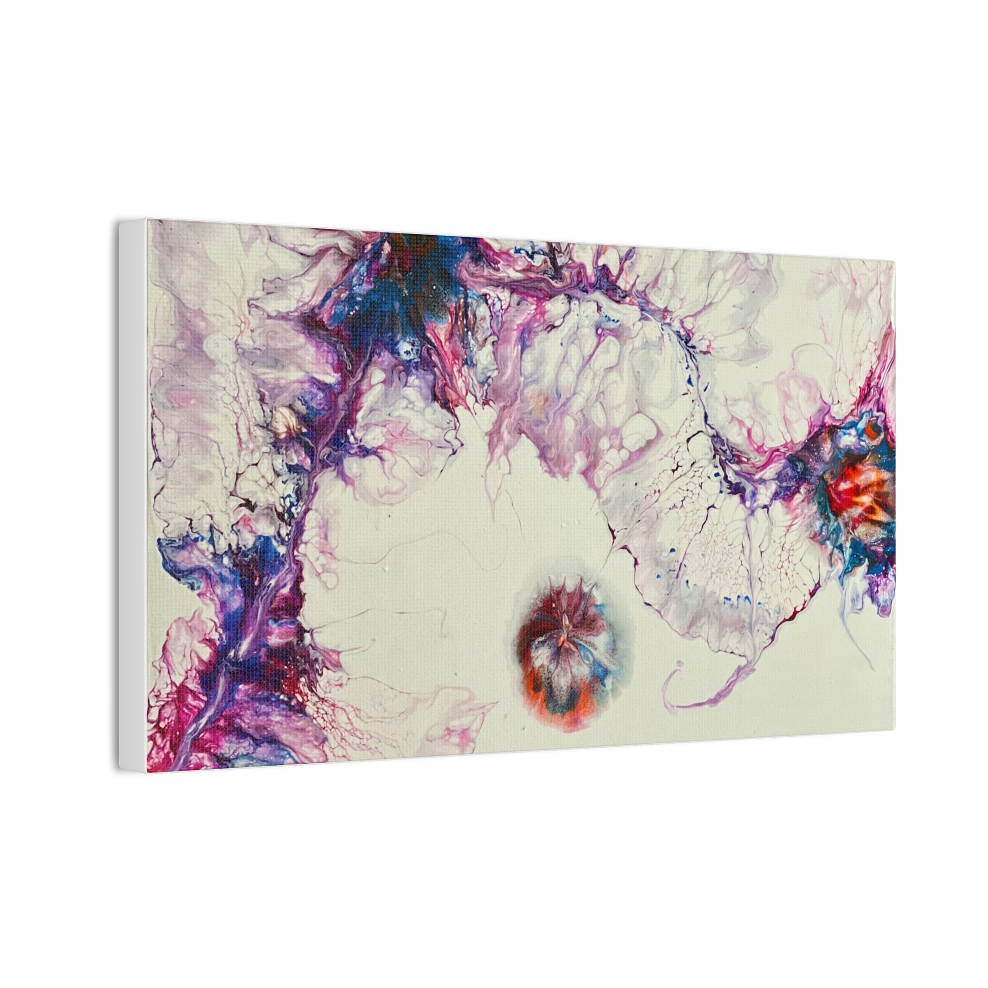 "Rift in Time" is an abstract masterpiece that embodies the dynamic movement and intricate beauty of energy in motion. With soft yet vibrant swirls of purples, blues, and pinks splashed against a clean, neutral backdrop, this canvas evokes the spontaneity and fluidity of creative expression. The bursts of color resemble organic forms, almost like a cosmic river or neural pathways, inspiring contemplation and curiosity.