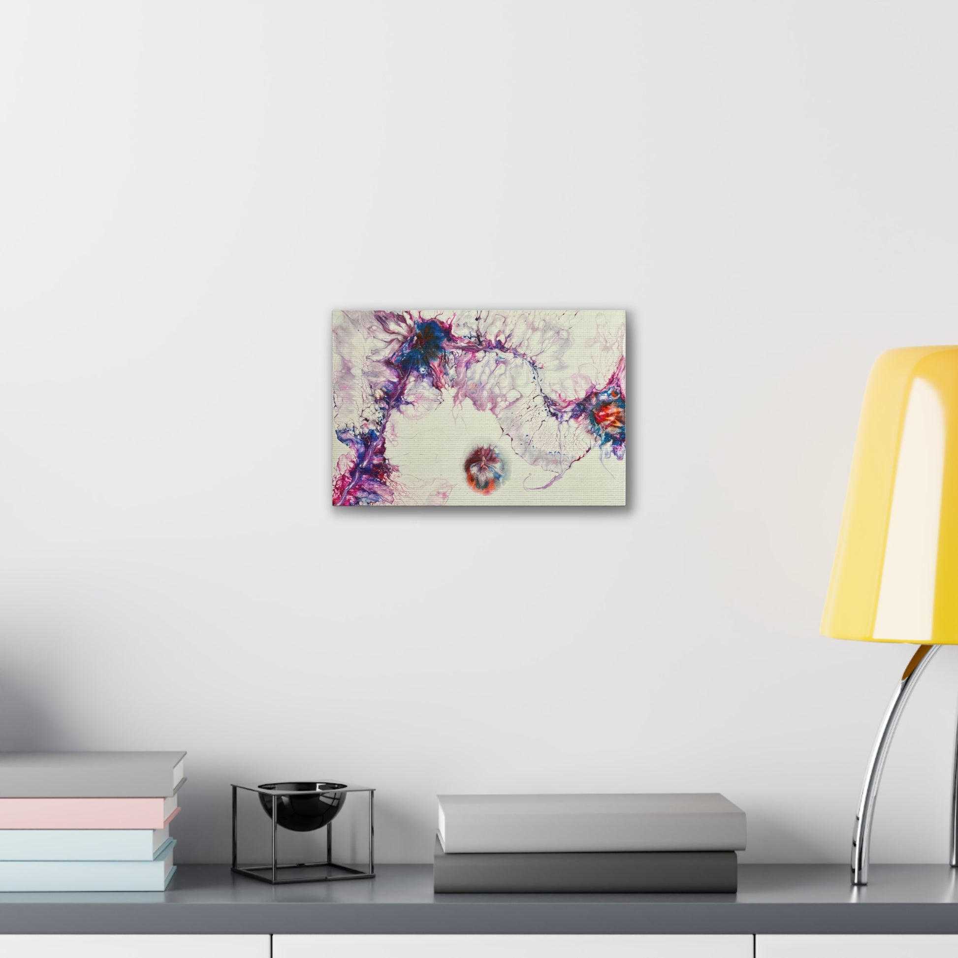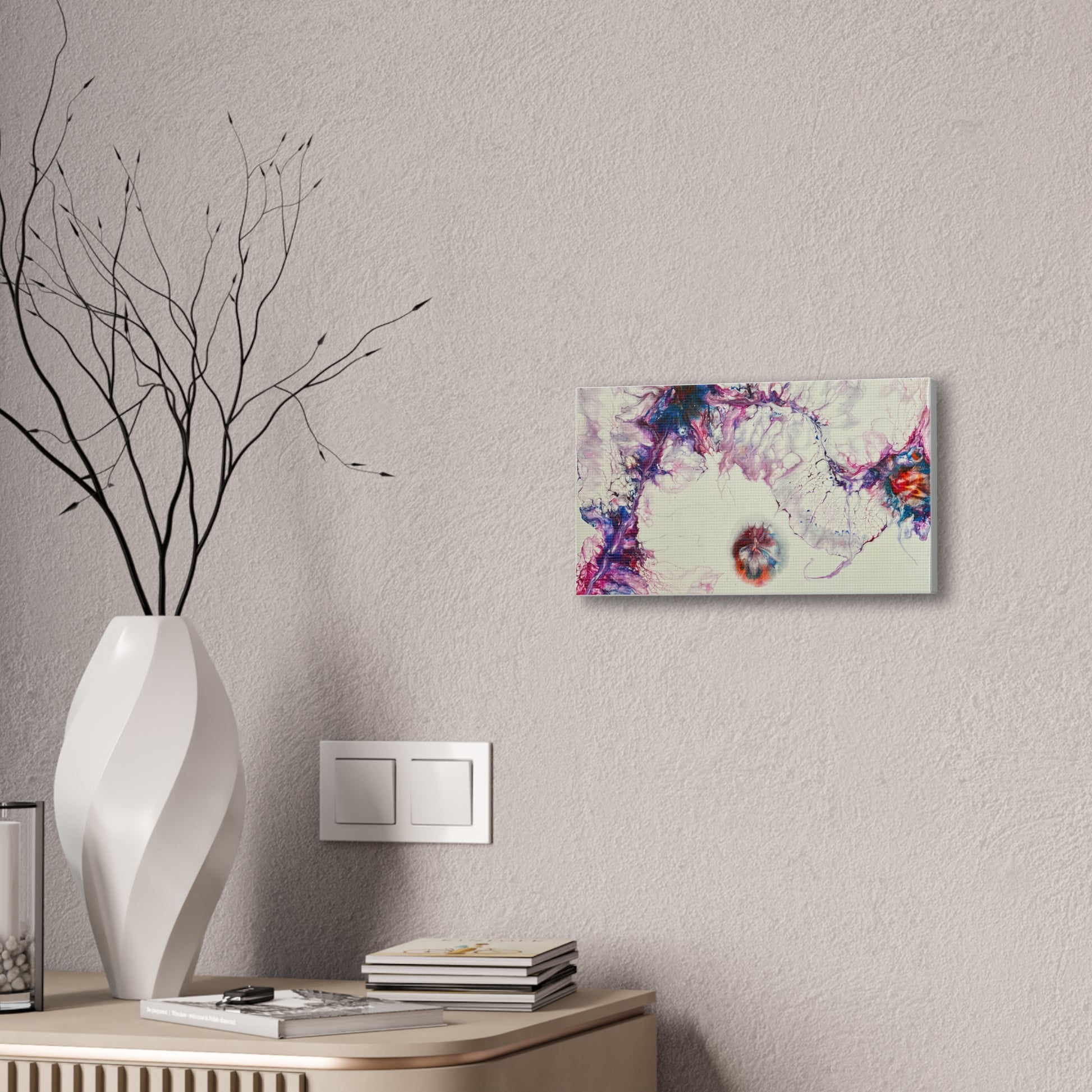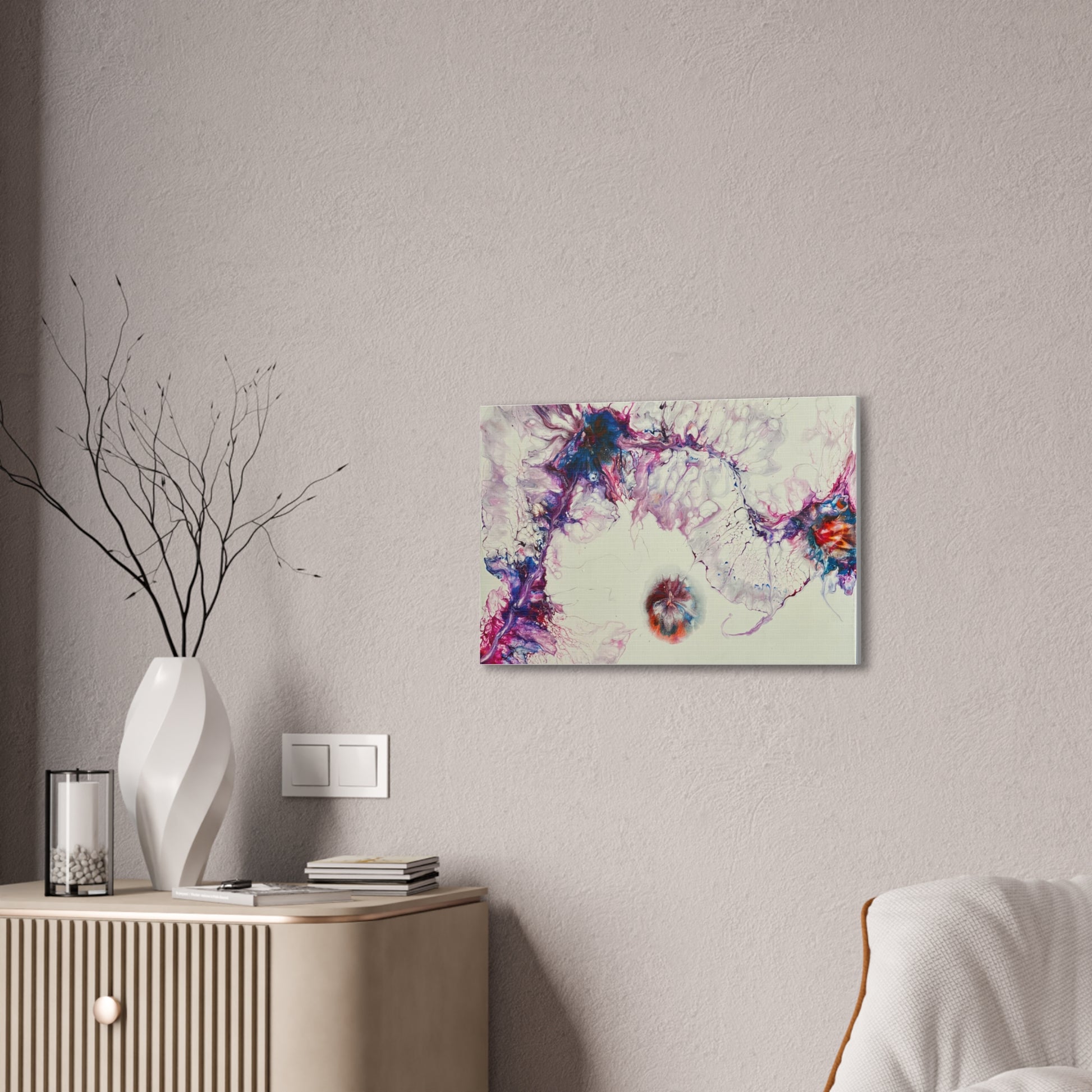 "Rift in Time" is an abstract masterpiece that embodies the dynamic movement and intricate beauty of energy in motion. With soft yet vibrant swirls of purples, blues, and pinks splashed against a clean, neutral backdrop, this canvas evokes the spontaneity and fluidity of creative expression. The bursts of color resemble organic forms, almost like a cosmic river or neural pathways, inspiring contemplation and curiosity.